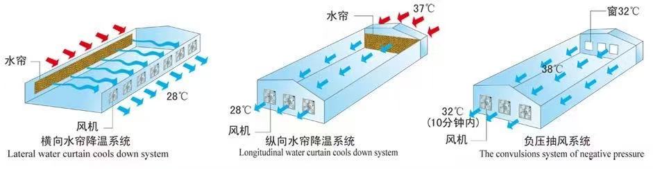 Quạt hút và tấm làm mát sẽ được lắp đặt ở bức tường đối diện, áp suất âm lớn, không khí nóng sẽ được thoát ra bên ngoài nhà kính/trang trại gia cầm, Tấm làm mát bay hơi và ngày càng nhiều không khí lạnh đi vào. Như vậy sẽ có chức năng làm mát tốt hơn.